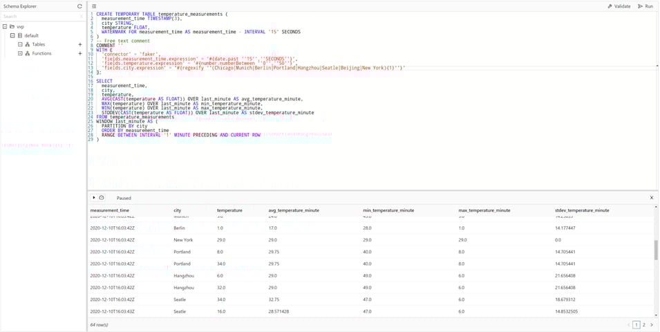 In this example, you are trying to identify outliers in the temperature_measurements table. For this, you will use an OVER window to calculate, for each measurement, the maximum (MAX), minimum (MIN) and average (AVG) temperature across all measurements, as well as the standard deviation (STDDEV), for the same city over the previous minute.