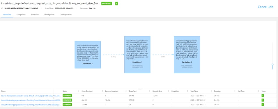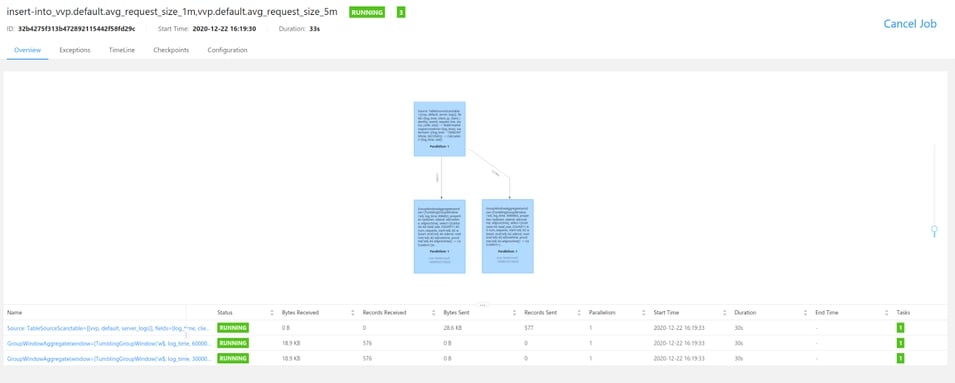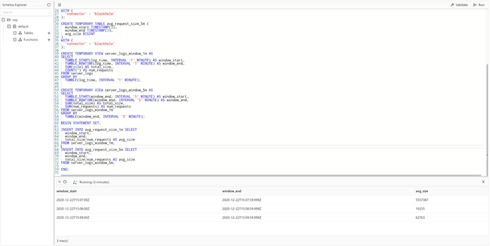 In the server_logs table, the average request size over one minute as well as five minute (event) windows will be computed. For this, you could run two queries, similar to the one in Aggregating Time Series Data from the Flink SQL cookbook. At the end of the page, you will find the script and the resulting JobGraph from this approach.