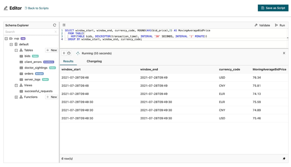 In one of our previous recipes, we've shown how you can aggregate time series datausing TUMBLE. To display every 30 seconds the moving average of bidding prices per currency per 1 minute, you will use the built-in HOPfunction.