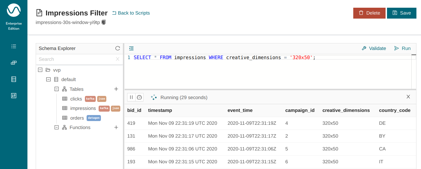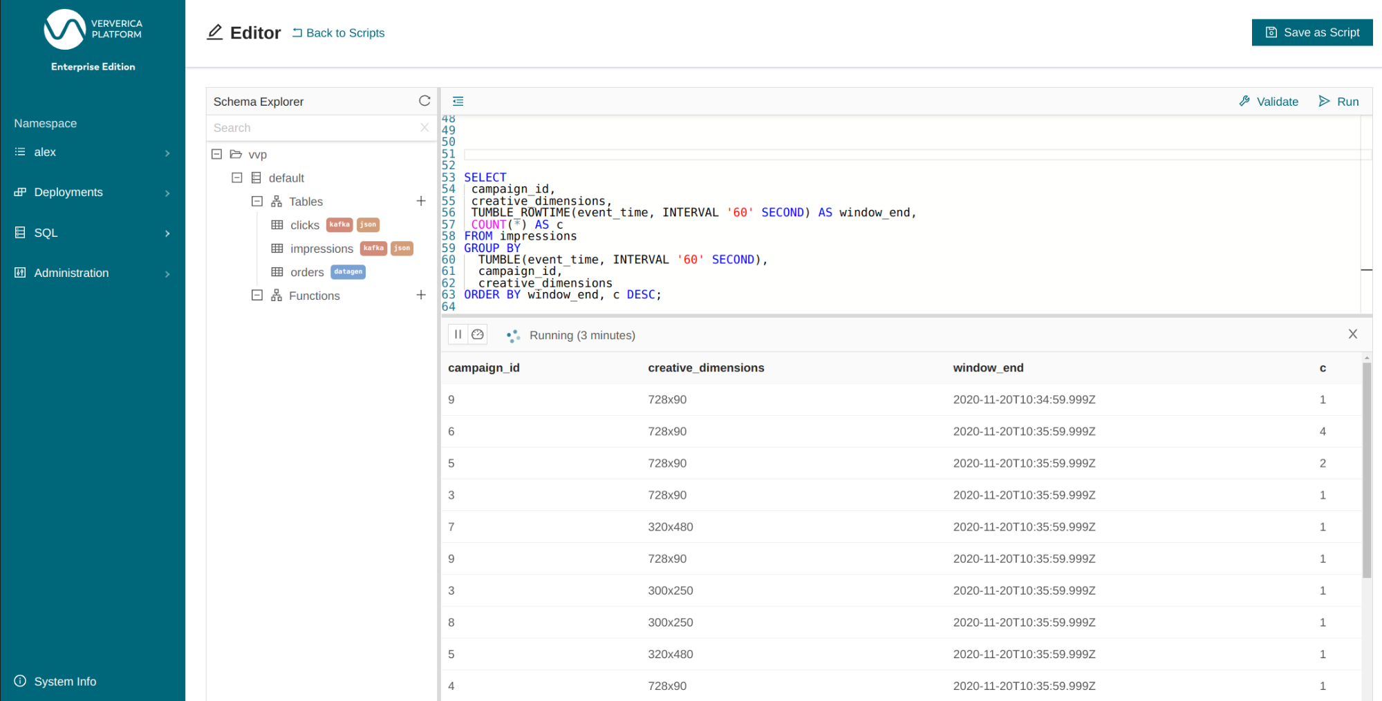 The following query calculates the number of impressions within a tumbling window of 60 seconds broken down by campaign_id and creative_dimensions:
